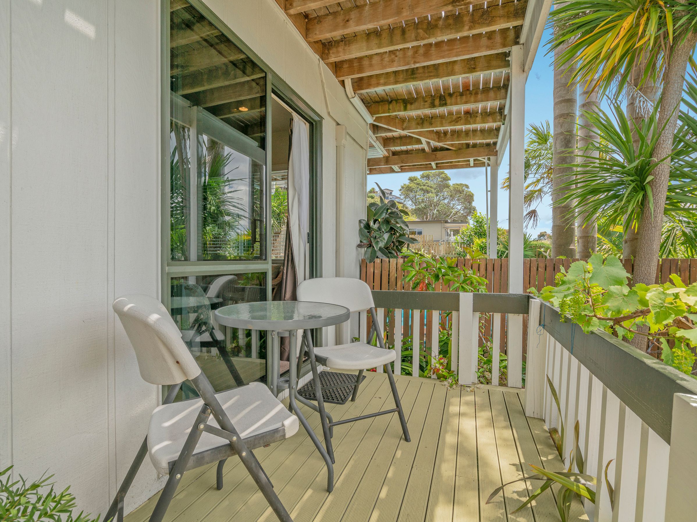 Both of the bedrooms in the apartment have super king-size beds, which can also be used as two twin beds. Please let us know when you book if you want twin beds. Linen, duvets and pillows are provided. There is also a heat pump, a wardrobe, two chairs and a table, luggage racks, towels/beach towels, and a ranch-slider opening onto the front deck with table and chairs and a view of Mt Paku.